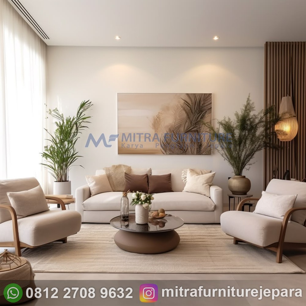 Kayu jati dari Jepara terkenal di seluruh Indonesia bahkan mancanegara karena kekuatannya, daya tahan terhadap rayap, serta serat kayunya yang indah. Ketika bahan berkualitas ini dipadukan dengan desain minimalis, terciptalah sofa tamu yang tidak hanya nyaman tetapi juga memiliki nilai estetika dan eksklusivitas tinggi. Gaya ini sangat cocok bagi Anda yang ingin menghadirkan nuansa modern namun tetap berakar pada keanggunan klasik khas furnitur Jepara.
