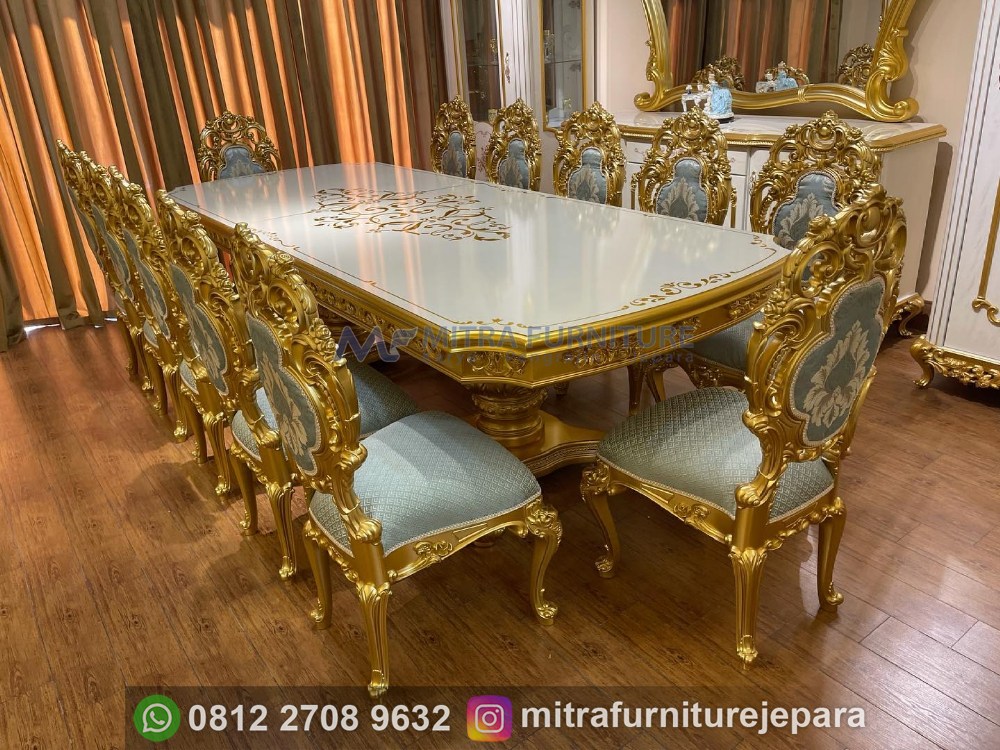 Meja makan dengan 10 kursi menjadi pilihan ideal untuk rumah besar, vila, atau hunian bergaya klasik yang menonjolkan keanggunan interiornya. Kehadirannya tidak hanya menambah nilai estetika ruangan, tetapi juga menggambarkan kemapanan dan cita rasa seni pemilik rumah. Kombinasi antara material kayu jati, marmer, hingga sentuhan ukiran tangan khas Jepara membuat meja makan bergaya Eropa klasik ini menjadi simbol kemewahan sejati yang tak lekang oleh waktu.