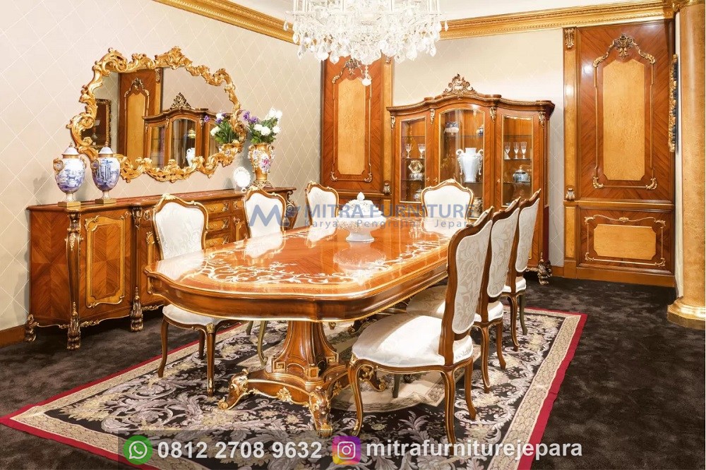 Keindahan meja makan ini tidak hanya terletak pada tampilan luarnya, tetapi juga pada struktur kayu solid yang kokoh dan tahan lama. Bentuknya yang proporsional dengan enam kursi menjadikannya ideal untuk keluarga atau ruangan besar yang sering digunakan untuk menjamu tamu. Kombinasi antara nilai estetika dan kekuatan material menjadikan meja makan mewah ini investasi jangka panjang untuk mempercantik ruang makan Anda.