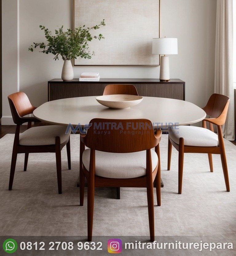 Bagi pencinta furnitur berkualitas tinggi, meja makan jati minimalis terbaru selalu menjadi pilihan unggulan. Kayu jati dikenal dengan kekuatannya, serat alami yang indah, serta daya tahan terhadap rayap dan kelembapan. Dalam desain minimalis modern, kayu jati diolah dengan teknik finishing halus untuk menciptakan tampilan elegan yang cocok untuk apartemen bergaya urban.